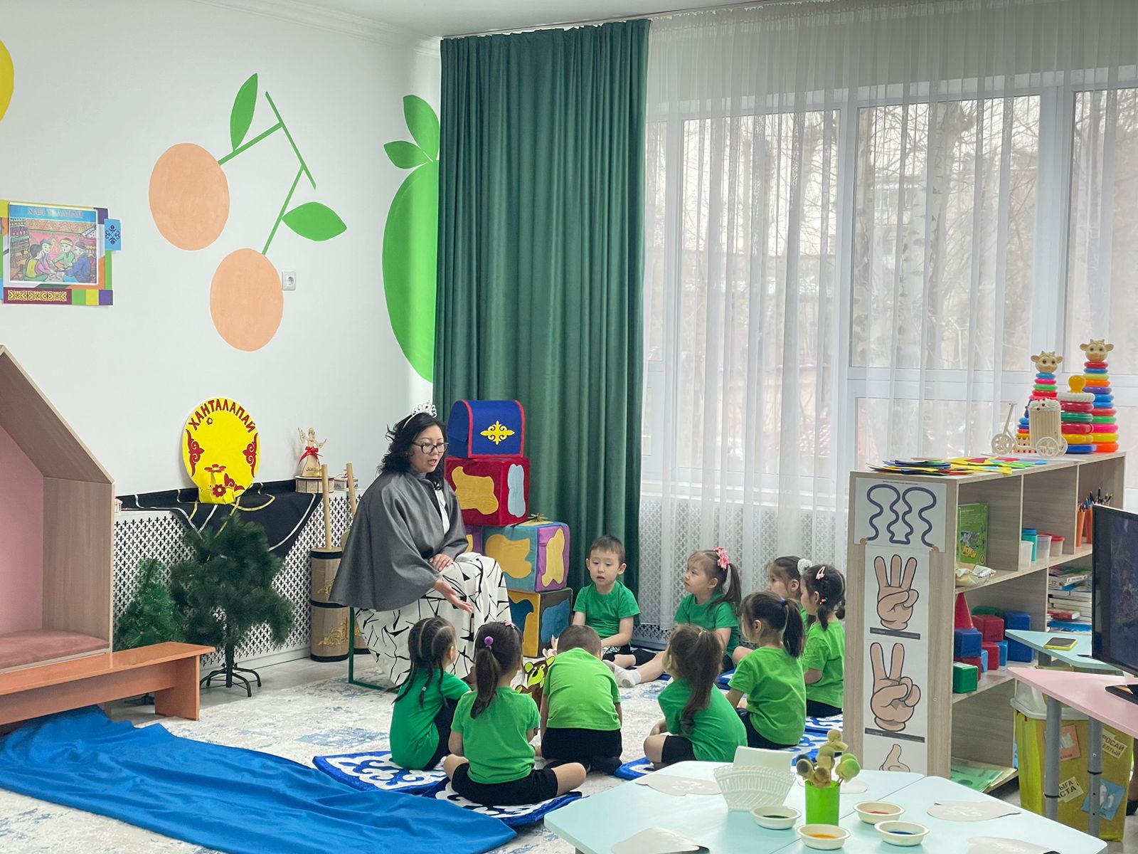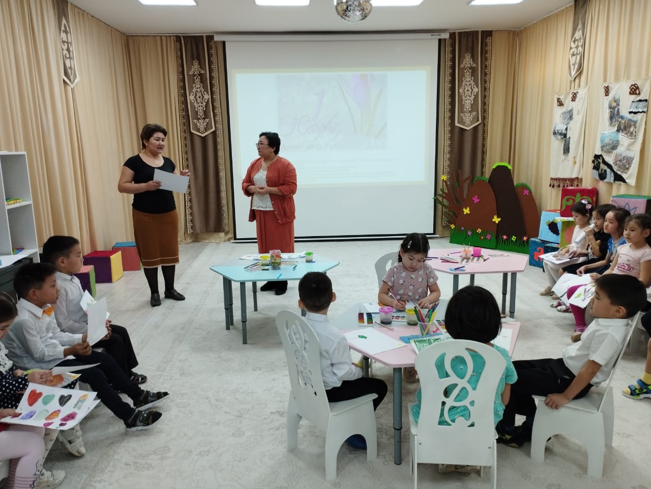 В соответствии с месячным планом работы на март 2023 года, в детском саду проводилось развлечение «Қош келдің, әз Наурыз!». В ходе мероприятия были проведены инструктажи по соблюдению правил безопасности, музыкальный зал был оформлен в соответствии с праздником. На развлечении знакомили детей с национальным колоритом казахской культуры посредством игр: «Оқтау тартыс», «Бестемше», «Ханталапай», «Арқан тарту», песен и стихов. Созданная в детском саду «Школа бабушек», пропагандировала обычаи и традиции, показала обычай «Тұсау кесу», «Ат қою», «Қырқынан шығару», «Бесікке салу» и др. Во время праздника в саду царила атмосфера добра, веселья и радости. Дети с интересом принимали участие, знакомились с новыми казахскими традициями и обычаями, играми. С целью повышения интереса к традициям и обычаям казахского народа была организована выставка национальных изделий и поделок.